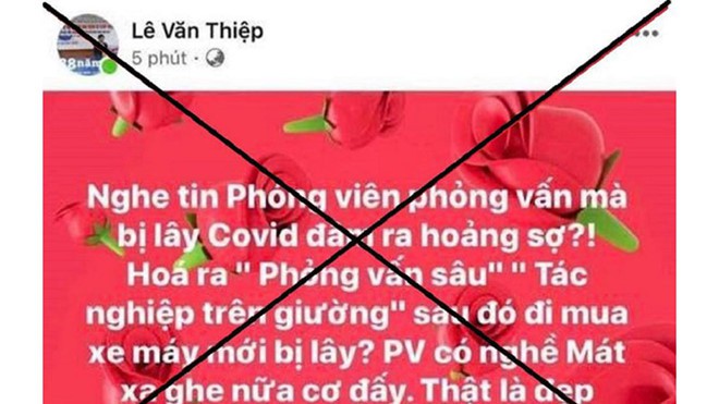 Trước đó, tại tài khoản Facebook mang tên Lê Văn Thiệp đã có dòng nội dung: “Nghe tin phóng viên phỏng vấn mà bị lây Covid đâm ra hoảng sợ?!. Hóa ra “phỏng vấn sâu” “Tác nghiệp trên giường” sau đó đi mua xe mới bị lây?. PV có nghề Mát xa ghe nữa cơ đấy. Thật là đẹp mặt! Dễ với Tây lông quá. Khà khà”.