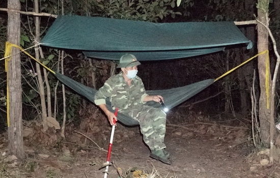 Đêm giữa rừng mới giúp ta cảm nhận được không khí oi bức, thỉnh thoảng có cơn gió nhẹ thoáng qua nhưng không đủ xua tan không khí ngột ngạt nơi này. Một người ngồi trên chiếc ghế xếp, mắt theo dõi xung quanh cùng ánh đèn pin; một chiến sĩ khác mắc võng cách đó không xa nằm đung đưa cùng ánh đèn pin soi rọi tứ phía; một chiến sĩ khác nằm ở vị trí xa hơn chút cũng giữ thao tác quen thuộc ấy, thỉnh thoảng lại rảo bước xung quanh để tuần tra, kiểm soát.