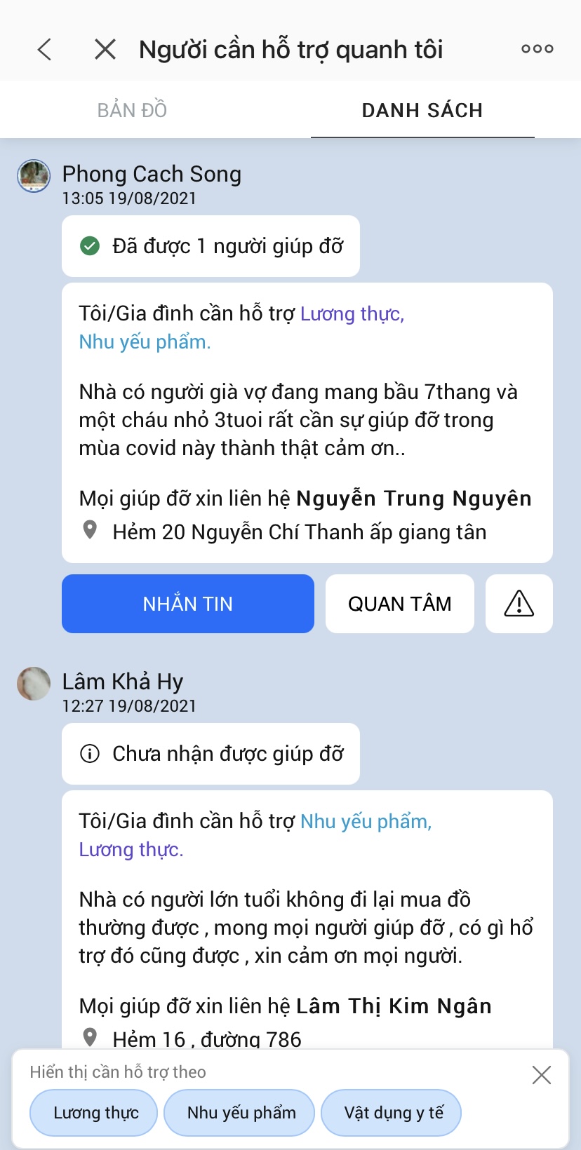 Khi mở vào danh sách những người cần giúp trên ứng dụng, có thể thấy có rất nhiều người dân có hoàn cảnh khó khăn cần được trợ giúp. Tài khoản Gia Khánh, ở số 21, hẻm 43, đường Ngô Quyền, ấp Trường An, xã Trường Tây (thị xã Hòa Thành) đăng thông tin cần được hỗ trợ lương thực vào ngày 17.8.2021.